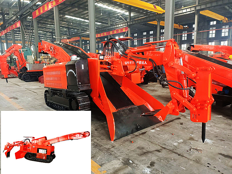 扒渣机带破碎锤就是在普通的扒渣机或者是定制的扒渣机机身挖斗部分添加一个液压锤,主要功能就是破碎大的矿渣石块,让扒渣机可以快速扒渣,避免大的矿渣或者是石块堵塞输送口或者是输坏输送皮带和输送架。修复矿山巷道,液压锤可以在隧道里面对岩壁进行修复整理,避免石块落下来,砸到工作人员或者是扒渣机。破壁功能,例如岩壁坚硬,又不能放炮时,就需要就需要液压锤来进行破碎,这样扒渣机就可以一边破碎一边扒渣了。